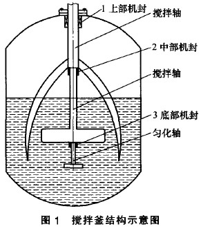 某制藥公司生產(chǎn)的藥霜工藝流程裝置核心設(shè)備 IH/R03攪拌釜是意大利pressinduspria公司提供的,結(jié)構(gòu)如圖1所示。通過攪拌釜高速的旋轉(zhuǎn),將不同成分原料藥進行充分混合,制成藥霜成品。2001年開工后,在攪拌過程中,經(jīng)常有黑色石墨污染白色藥霜,造成產(chǎn)品的成批報廢。不但影響了產(chǎn)品的交貨期,而且增加了產(chǎn)品的成本。嚴重地影響了產(chǎn)品的品質(zhì)及公司信譽。