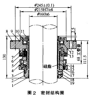 該設(shè)備的型號為:te3—4000, 攪拌直徑約為 1500mm,罐體容量為4000L。壓力:一0.5~3MPa (A)溫 度:20℃~84℃;工作轉(zhuǎn):12~16r/min。從攪拌釜示意圖 (圖1)中可以看出,該釜的較大軸為空心攪拌軸,裝有錨式攪拌頭,軸徑為 φ160,軸與反應(yīng)釜之間有一套密封裝在反應(yīng)釜的上部(見圖2),為上部機封(件號1); 第二根軸也是空心攪拌軸,裝有槳式攪拌頭,軸徑為φ 120,裝在較大軸里面,較大軸與第二根軸之間有相對運動,裝有一套密封,為中部機封(件號2);第二根軸里面還裝有一根實心軸,裝有勻化器,它們之間也裝有 一套密封,為底部機封(件號3)。這套密封是浸在藥液里面,有潤滑和良好的冷卻作用。因此,采用了硬質(zhì)合金對硬質(zhì)合金摩擦副配對的機械密封,避免了污染,同 時其密封壽命也非常長。而上部與中部的機械密封的摩擦副端面無法得到液體冷卻和潤滑。在生產(chǎn)過程中, 當釜內(nèi)的壓力為一0.5MPa時,外部的大氣壓會將上部 (件號1)和中部(件號2)密封石墨摩擦副端面磨損掉的碳黑擠壓進釜體內(nèi)造成污染。