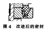 為了能夠?qū)⑺姆鷳?yīng)用于摩擦副.同時避免溫度變化影響。通過反復(fù)的試驗,設(shè)計了一種特殊的結(jié)構(gòu)。如圖4在該結(jié)構(gòu)里。四氟密封環(huán)底部裝有橡膠O形密封 圈,當溫度降低時,四氟收縮,其與環(huán)座之間出現(xiàn)間隙。 這時,受到密封彈簧壓緊力和腔體內(nèi)的壓力的作用。四氟密封環(huán)壓向O形圈,保證介質(zhì)不會從鑲嵌部位泄漏,如果溫度升高,該四氟密封環(huán)的外徑增大,由于結(jié)構(gòu)的約束,會產(chǎn)生一個沿著與環(huán)座配合的楔形面向上的分力,密封環(huán)的徑向變形轉(zhuǎn)換成軸向移動.密封環(huán)在徑向受到的約束力小,產(chǎn)生的變形非常微小,不會導(dǎo)致密封失效。