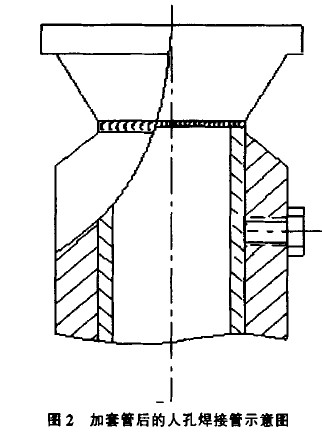 (3)介質(zhì)對容器壁的影響氫氣和微量的硫化氫在此工作壓力和工作溫度時不會對復(fù)合層OCr18Ni10Ti和基層材質(zhì)15CrMOR產(chǎn)生氫腐蝕。綜上分析可知,該裂紋是因堆焊而產(chǎn)生的。堆焊層間溫度控制不穩(wěn)定.合金元素的流失產(chǎn)生硬脆的馬氏體組織,焊后熱處理溫度不均勻是裂紋生成的主要因素。加氫不銹鋼反應(yīng)釜消除缺陷的工作是重中之重,制造廠提出回廠全面返修,徹底消除隱患。用戶認為不能耽誤生產(chǎn)工期,由于裂紋產(chǎn)生的原因和裂紋并未對基材造成破壞。采取了在人孔焊接管內(nèi)加0Cr18Ni10Ti的4mm套管,如圖2所示。